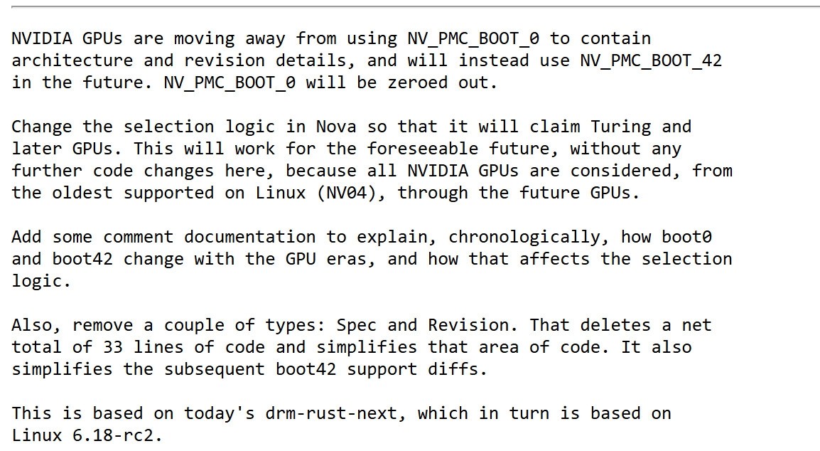 寄存器升级:未来 Rubin 架构的 GPU,其架构与修订版本数据将存储于全新的 NV_PMC_BOOT_42 寄存器,当前使用的 NV_PMC_BOOT_0 寄存器